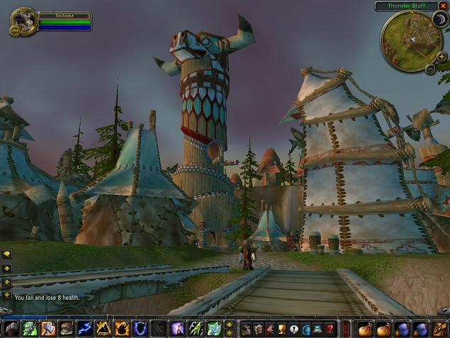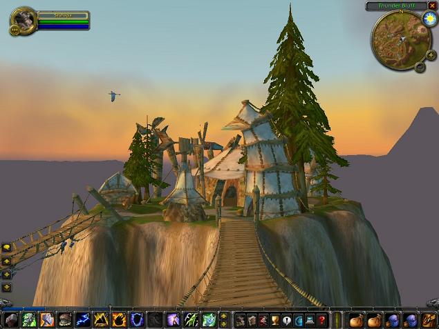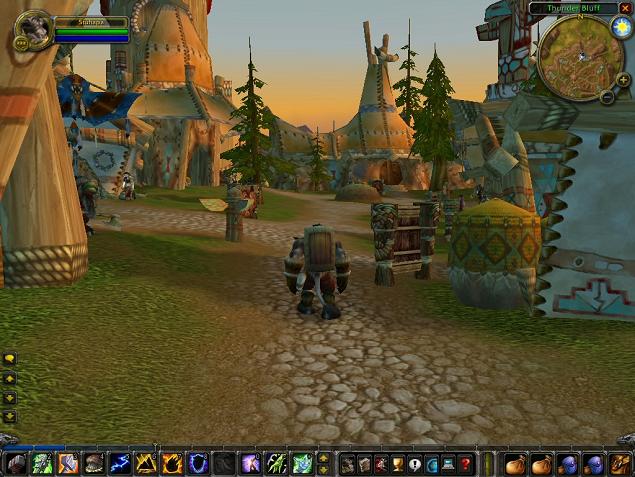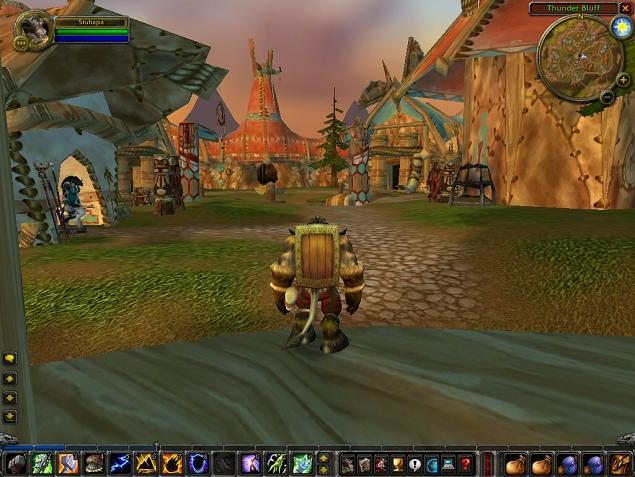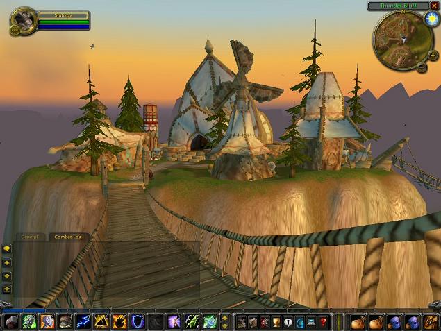Arrivée au niveau 1 de Thunder Bluff par l'ascenseur sud-ouest. Le grand totem est l'escalier en colimaçon central qui relie les trois niveaux entre eux.
