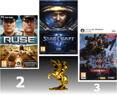 Commençons par la Catégorie "Meilleur Jeu de Stratégie en Temps Réel". Ici, sans grande surprise, c'est le jeu de Blizzard qui se mange la part du lion. Meilleures ventes de l'année, plusieurs fois récompensé, Starcraft II s'impose donc logiquement et avec facilité sur ses deux dauphins : R.U.S.E, qui se voit récompenser pour ses excellentes qualités, et la première extension de Dawn of War 2, Chaos Rising. En revanche, Supreme Commander 2 et, surtout, Command and Conquer IV n'ont que peu réussit à vous séduire, malgré leurs célèbres licences. La preuve que "révolution" ne rime qu'assez rarement avec succès.