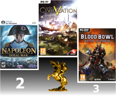 Aujourd'hui, nous continuons notre tour d'horizon des 10 catégories avec l'élection du "Meilleur Jeu de Stratégie en Tour par Tour". Cette catégorie a donné lieu à de féroces batailles pour la première et la troisième place. Ils étaient deux à se disputer le titre : Civilization V et Napoléon : Total War. Quoi de plus logiques puisqu'il s'agissait des deux favoris, des deux poids lourds du genre. C'est finalement Civilization V qui l'emporte à quelques voix près. A la troisième place, le duel opposait Blood Bowl : Edition Légendaire et Rise of Prussia, l'excellent wargame à l'ancienne d'AGEOD. C'est finalement le titre de Cyanides qui a reçu votre préférence. Il complète donc un podium qui a fière allure. Voilà 3 jeux à posséder absolument pour qui aime la stratégie et aime avoir le temps de la savourer. Enfin, Elemental : War of Magic termine largement dernier, payant ainsi son lancement trop précoce et ses nombreux défauts de jeunesse.