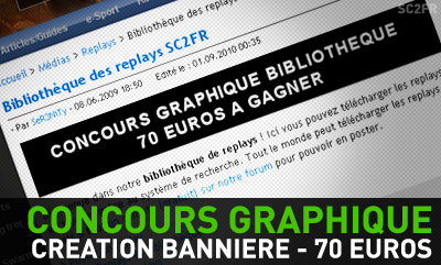 Starcraft 2 France, site appartenant au Réseau Jeux-Stratégie, vous propose aujourd'hui un nouveau concours avec 70 € à la clé. Après vous avoir proposé des quizz et un concours de slogans, nous vous proposons aujourd'hui un concours graphique. Le but du concours est de créer une bannière pour la bibliothèque de replays SC2FR.