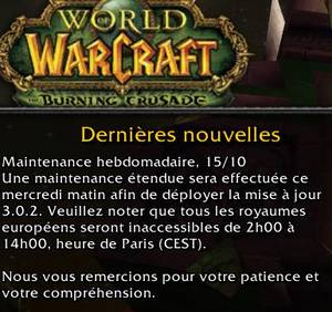 Aujourd'hui, il est prévu une maintenance des royaumes de 5H à 11H (heure de Paris). Malheureusement, cette maintenance est toujours en cours et devrait se terminer à 15H. On ne sait pour le moment quelle est la raison de cette prolongation ...