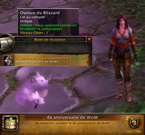 Pour récompenser les joueurs qui se connecteront aujourd'hui, l'équipe de Blizzard récompensera le personnage d'un haut-fait et le joueur d'un animal de compagnie, un petit ourson blanc (cf ci-dessous).