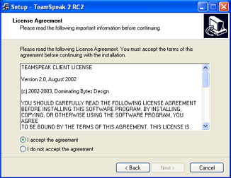 3- Une fenêtre vous demande si vous voulez installer TeamSpeak 2, vous mettez oui. Une autre fenêtre apparaît, vous cliquez sur "next". C'est alors qu'on vous demande d'acceptez la license. Vous sélectionnez alors "i accept the agreement" et vous cliquez sur "next".