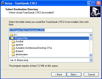 4- Une fenêtre vous demande où vous voulez installer TeamSpeak sur votre disque dur. Cliquez sur "next", le programme choisi trés bien tout seul où il faut qu'il s'installe.