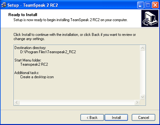 5- Le programme d'installation vous pose encore quelques questions (Voulez-vous une icône TeamSpeak 2 dans le menu "démarrer" ? Voulez vous une icône TeamSpeak 2 sur votre bureau ? Voulez-vous une tasse de café ? ;), ne touchez à rien et mettez toujours "next" jusqu'à arriver à l'écran "Ready to install".
