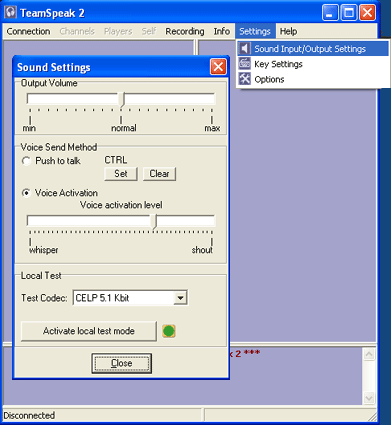 2- Allez dans "settings", "sound input/output settings". Et vérifiez que les paramètres correspondent à ceux de l'image ci-dessous. Ce qui est important, c'est de bien régler le "voice activation level". Pour cela cliquez une fois sur "activate local test mode". Plus vous mettrez le curseur vers la gauche (c'est par là <== ;), plus le micro sera sensible. A vous de faire en sorte que le micro ne s'active pas pour rien, mais qu'il s'active quand vous parlez. Donc parlez dans le micro, si le petit rond vert s'allume c'est que ça marche, si il ne s'allume pas c'est qu'il faut rendre le micro plus sensible (en mettant le curseur "voice activation level" plus vers la droite). Faîtes aussi attention à ne pas rendre le micro trop sensible, sinon on entendra votre respiration, ce qui n'est pas du meilleur effet ;). Quand vous avez fini votre réglage cliquez sur "desactivate local test mode" puis sur "close".