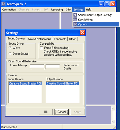 3- Allez dans "settings", "options". Et vérifiez que le son est en Waves. Remarquez que TeamSpeak peut aussi trés bien fonctionner en Direct Sound, ce dernier est plus performant mais à aussi plus tendance à ne pas fonctionner ;) Cliquez sur "Ok" pour valider.