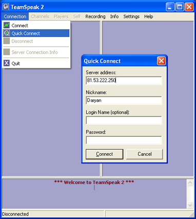 Pour discuter, il ne vous reste plus qu'à vous faire inviter par un serveur. La personne faisant serveur va vous donner une ip (exemple: "81.53.222.250"). Il vous suffit alors d'aller dans "connection", "quick connect" et de tapez l'adresse IP que l'on vous a donné dans "server adress" ainsi que votre pseudo dans "NickName". Vous cliquez sur "Connect", et normalement vous devriez rejoindre la conversation. Noté que vous ne pouvez pas vous connecter sans une IP de serveur valide, et que celle donné en exemple est fausse, ce n'est qu'un exemple. En fait il y a une IP qui correspond à chaque réunion qui a lieu. Ainsi, si la même personne vous invite à une discussion un jour puis un autre, elle vous donneras une ip différente à chaque fois. Il est donc inutile de noter ou retenir les IP pour plus tard.