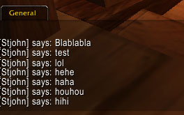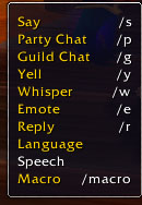 Via ce menu, vous retrouvez des boutons et les raccourcis à utiliser pour discuter directement (/s), en groupe (/p), avec votre guilde (/g), pour crier (/y), pour discuter en privé (/w NomDuJoueur), répondre au dernier message privé (/r). La liste des émotions que vous pouvez effectuer est disponible sous Emote (pleurer, saluer, s'asseoir etc) et celle des voix sous Speech. Language sert à utiliser un des autres langages que vous connaissez (par exemple, les nains parlent le nain et le language commun à l'alliance). Enfin, Macro vous permet de configurer des macro, un ensemble d'action prédéfinies.