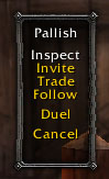 Le nom du joueur avec qui vous intéragissez apparaît bien évidemment, avec des options comme inspecter, qui vous permet de regarder ce qu'il porte sur lui actuellement, inviter, qui lui envoye une invitation à vous rejoindre dans un groupe, échanger, qui permet de donner/vendre/acheter des objets avec ce joueur, et suivre, qui ordonnera à votre personnage de suivre ce joueur, et vous bougerez sans avoir à vous fatiguer !