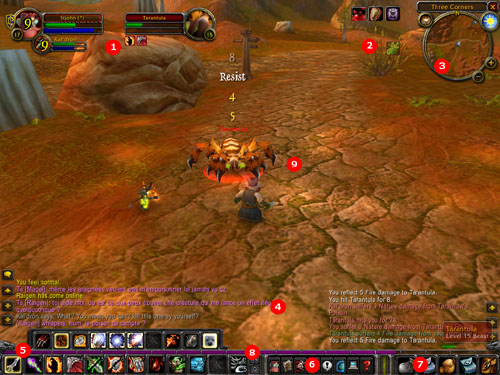 Avec les débuts de la Beta Europe et la stabilisation de l'interface, qui a beaucoup évolué au fil des patchs, il me semble qu'il est temps de présenter la fenêtre de jeu, pour aider les nouveaux venus et pour satisfaire la curiosité des autres ! Voilà à quoi ressemble la fenêtre de jeu lorsque l'on se ballade dans le Monde de Warcraft. Le but n'étant pas d'être exhaustif, il y a tant à dire sur cette interface, mais de vous donner un véritable aperçu d'ensemble du gameplay !