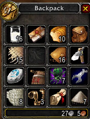 La barre des sacs, en bas à droite de l'écran, comporte 5 emplacements disponibles pour des sacs et sacoches. Les sacs peuvent avoir différentes capacités, et vous débutez simplement avec votre sac à dos de 16 places. Pour connaitre le nombre de place d'un sac, laissez simplement votre curseur dessus. En cliquant sur un sac, une fenêtre s'ouvre vous en indiquant le contenu :